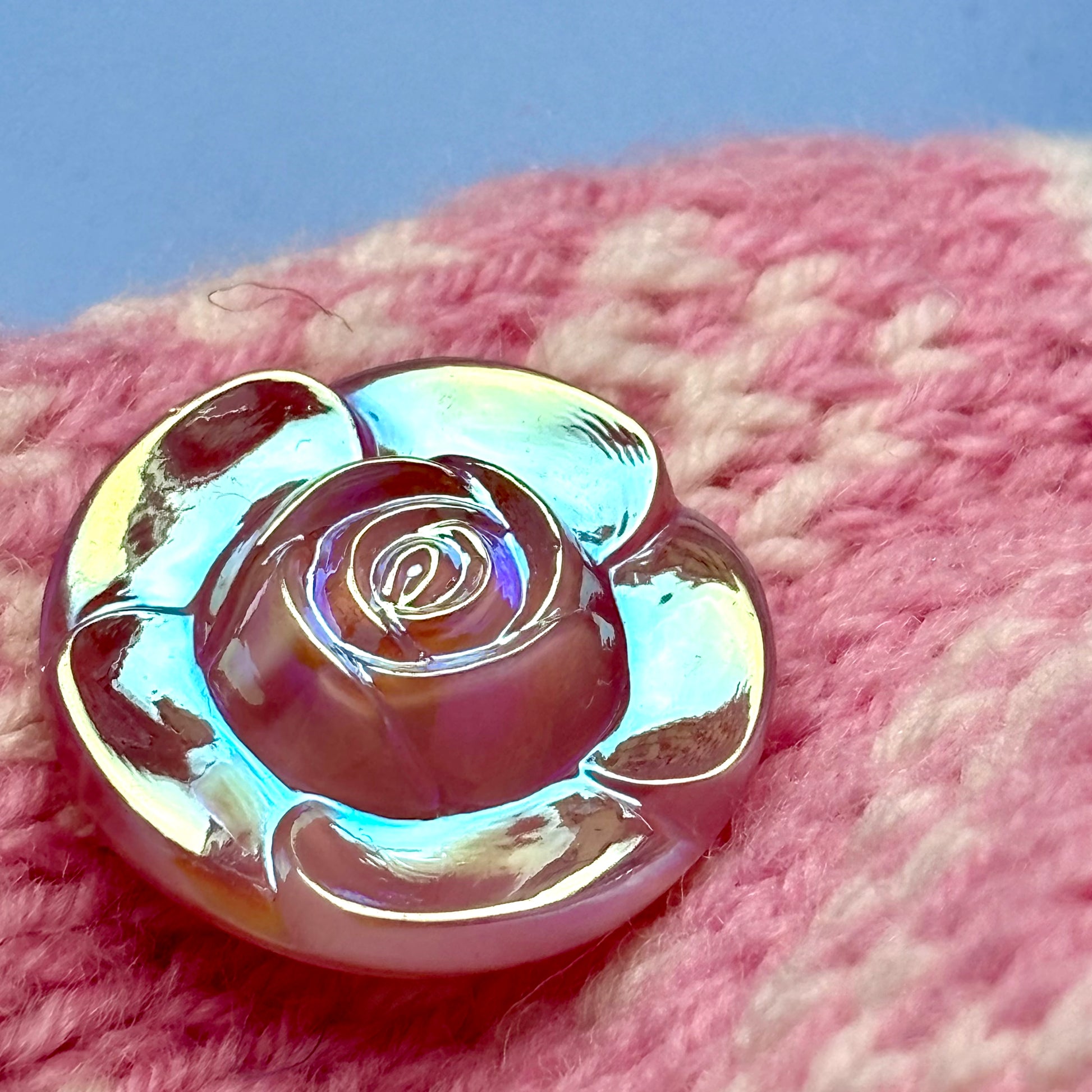 Stor, elegant glasknap formet som en smuk blomst med inspiration fra en klassisk rose. Den fine perlemorsskinnende overflade giver knappen et blødt, eksklusivt udtryk, der fanger lyset på den mest fortryllende måde.