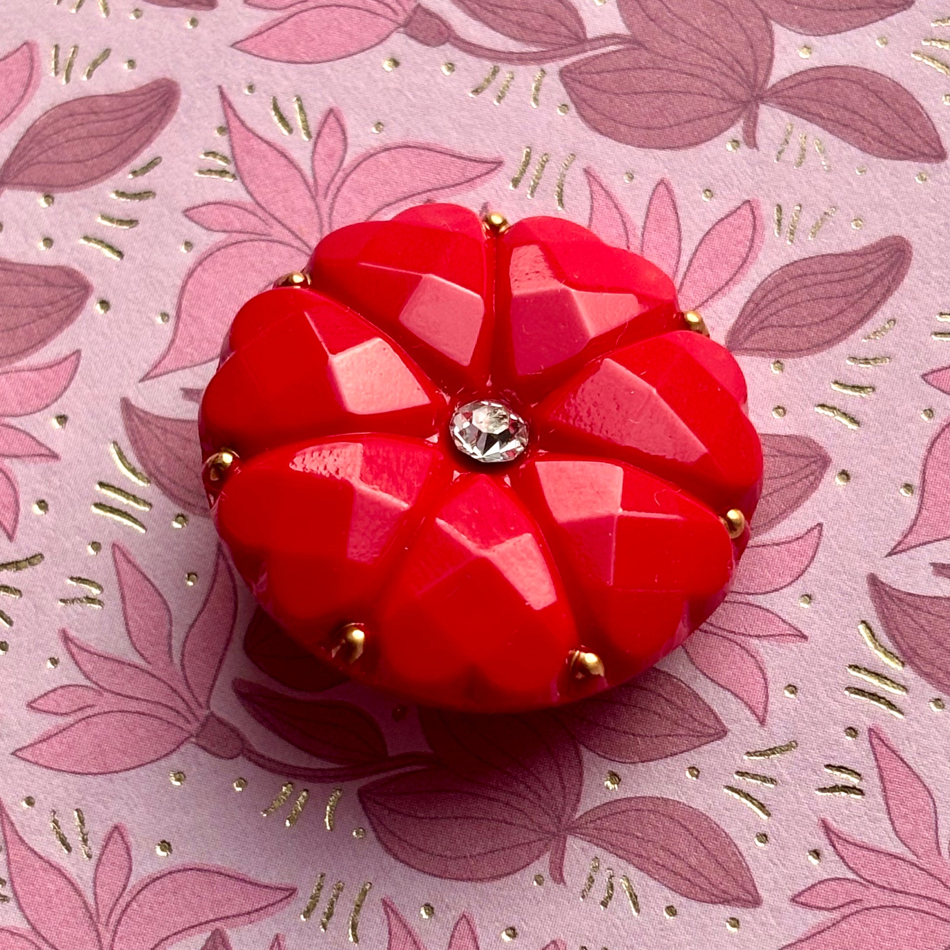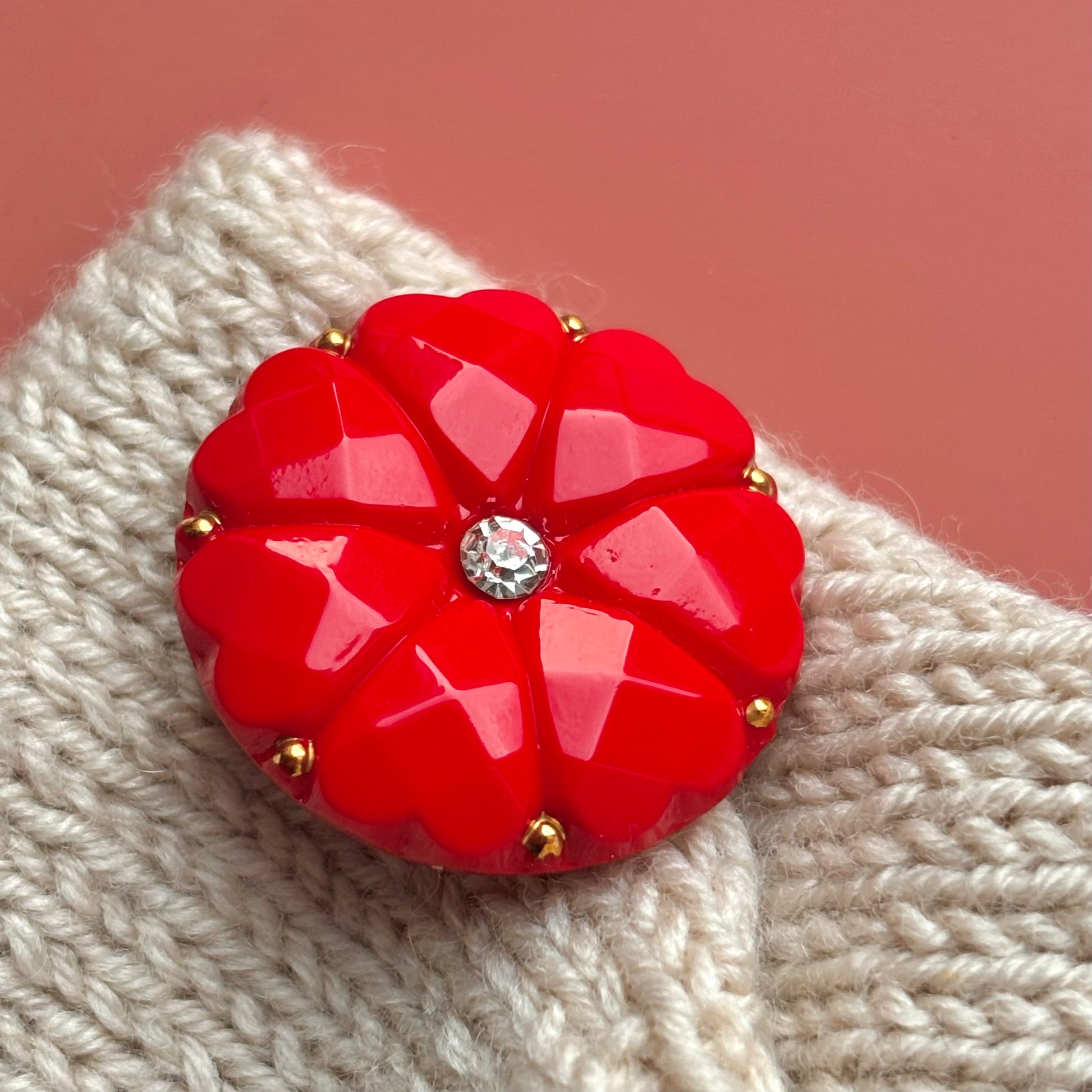 Fineste store røde glasknap med håndmalet guld prikker og en funklende klar rhinsten i midten. Glasknappen Dahlia er som blomsten stilfuld og vil tilføje ekstra bling hvor den bliver brugt. Knappen er let på grund af den buede bagside og nem at montere på alt tøj. Fungerer godt på strik, en cardigan eller jakke